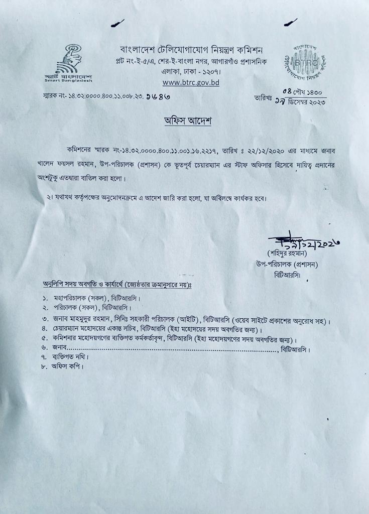 | ৩০/০১/২০২৪ | নং ১৪.৩২.০০০০.৪০০.৩২.৪৫১.২২.১৭৬ | অব্যাহতি |  |