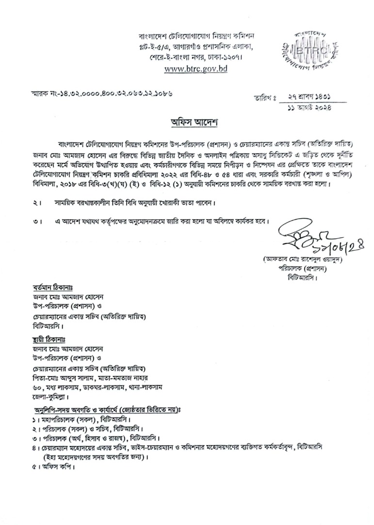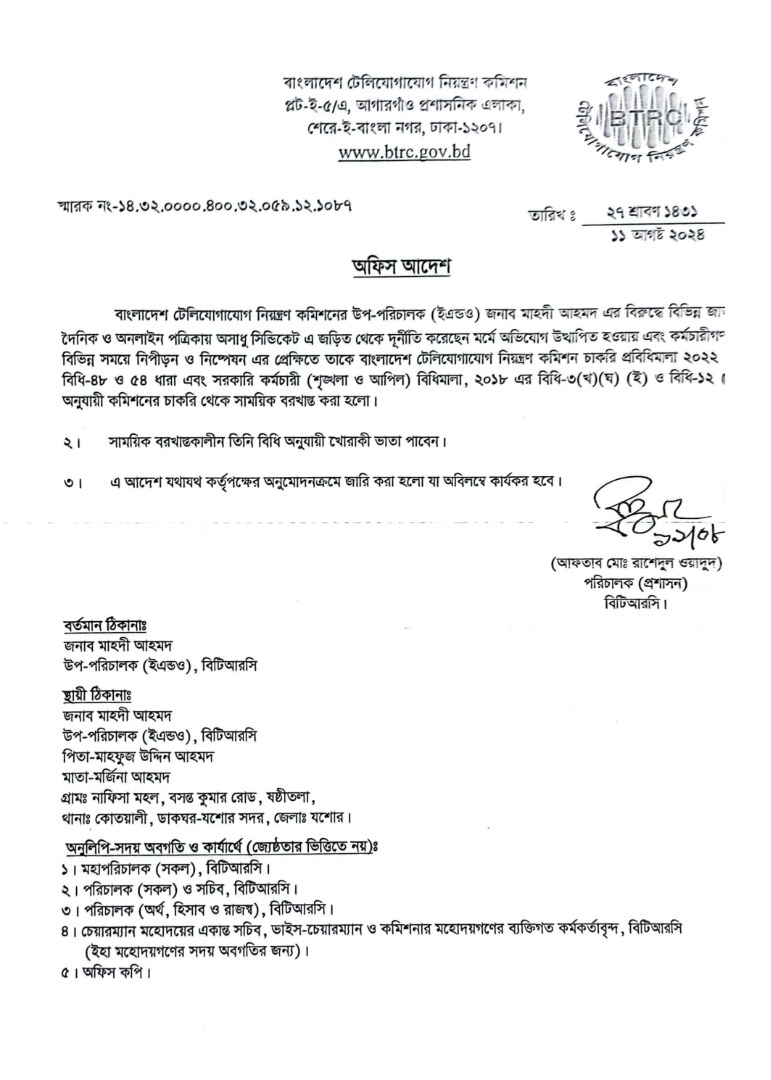 | ১১/০৮/২০২৪ | নং ১৪.৩২.০০০০.৪০০.৩২.০৬৩.১২.১০৮৬ | সাময়িক বরখাস্ত |  |