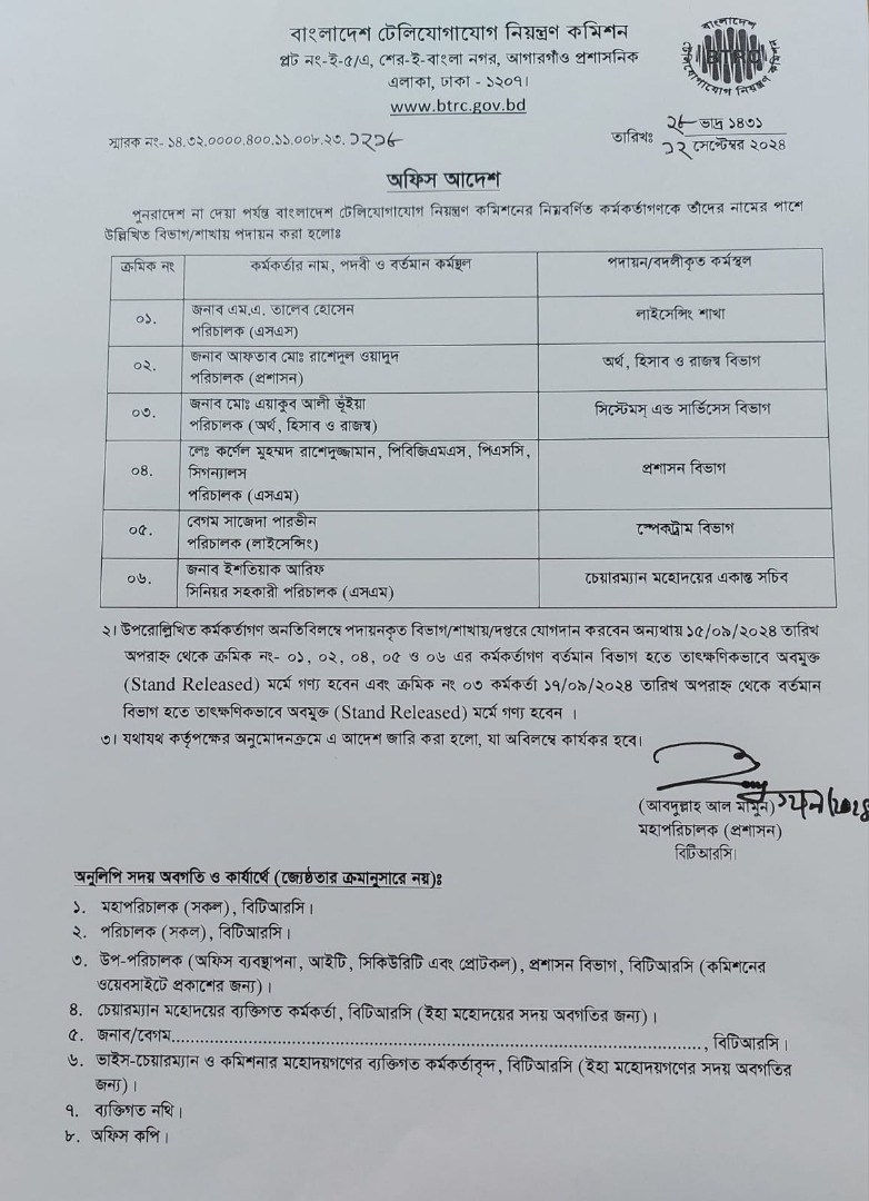 | ২৫/০৯/২০২৪ | নং ১৪.৩২.০০০০.৪০০.১১.০০৮.২৩.১২৬৫ | পদায়ন |  |