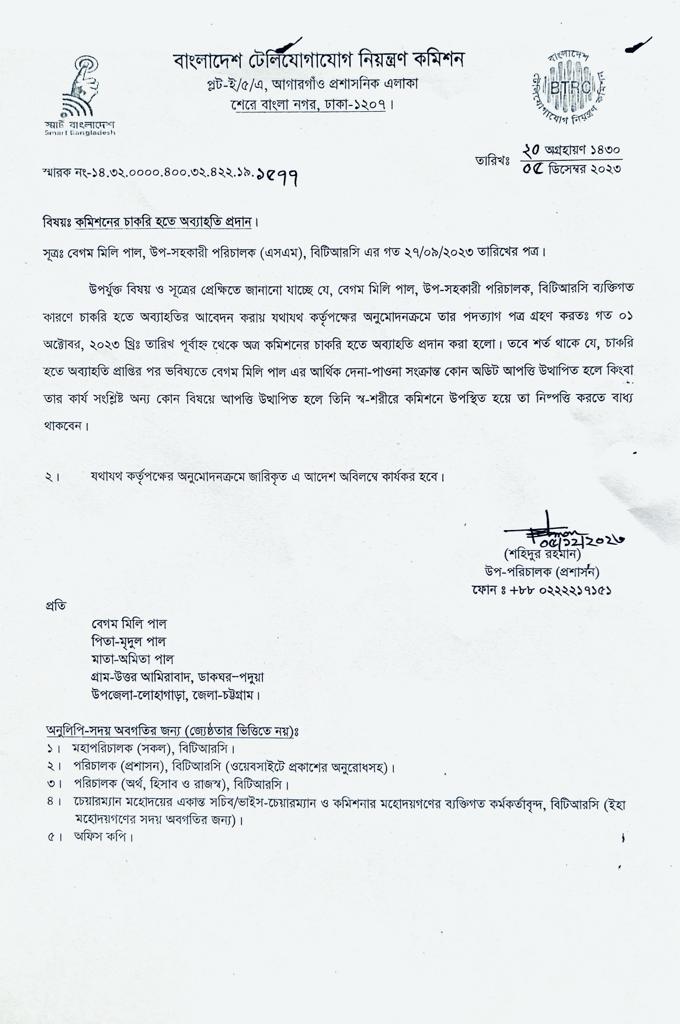 | ২৬/১১/২০২৩ | নং ১৪.৩২.০০০০.৪০০.৩২.৪৪৯.২২.১৫৩৭ | অব্যাহতি |  |
