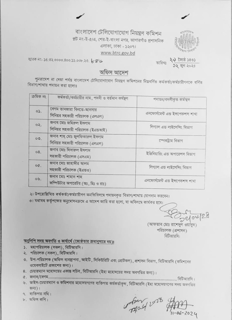 | ১২/০৬/২০২৪ | নং ১৪.৩২.০০০০.৪০০.১১.০০৮.২৩.৮৪৬ | পদায়ন |  |