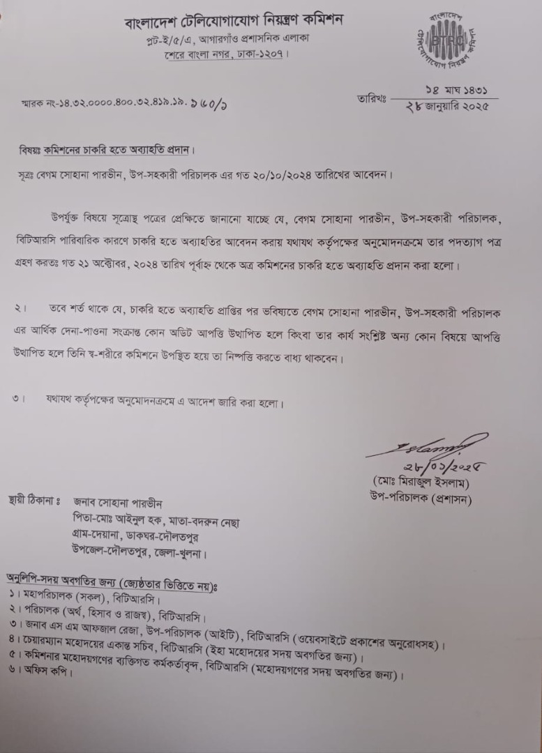 | ২৮/০১/২০২৫ | নং ১৪.৩২.০০০০.৪০০.৩২.৪১৯.১৯.১৬০ | অব্যাহতি |  |