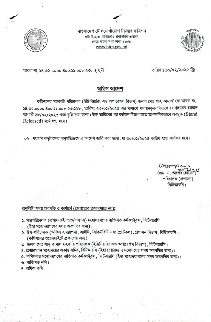| ১০/০২/২০২৫ | নং ১৪.৩২.০০০০.৪০০.১১.০০৮.২৩.২২৯ | পদায়ন |  |